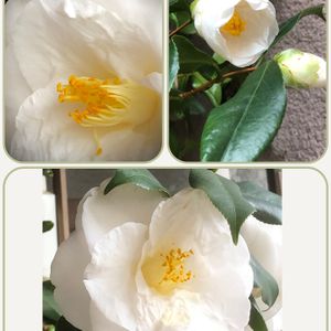 絞り染めの華やかな椿の中に 絞りがなくて白い椿が 咲き掛けと蕾が。。?? 突然変異が起きたのかしら?? 何年か前は真っ赤な椿が一つ 咲いたこともありました。 チョット喜んでいいのか? 変な気分ですよぉ〜🥹😁⁉️
