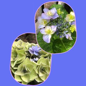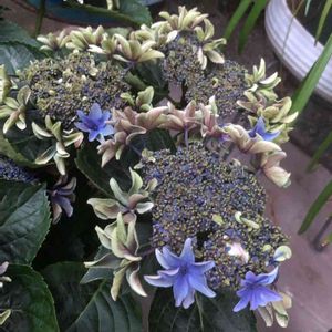 去年の母の日に貰った紫陽花が 今年も咲き出してくれました。 ☆ ↗️今年のです ☆ ↙️去年 八重がモリモリ ☆♪残念なことにネームが? 特許出願中!とタグ🏷️に🥲