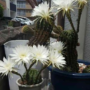 いつも仕事に行く途中に前を通る居酒屋のサボテン達が申し合わせた様に一斉に開花。不思議、、、別々の個体なのに🙄