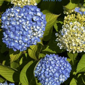 青い紫陽花らしい色になった、花畑の紫陽花 晴れ上がった青空も紫陽花色で、ルンルン気分