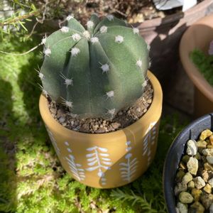 娘のサボテン 初め鉢を買ってきていて 丸いサボテンを植えたいと言ってましたが、 昨日ホームセンターからラベル付きのサボテン(王冠短毛丸)を買ってきました。 王冠短毛丸をネットで調べていましたが、稜の数が違うようです。 去年、私が買った短毛丸とも違います。 もしかしたら、大豪丸かもしれません。
