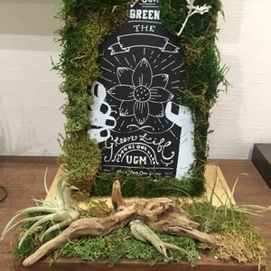 店舗のオブジェです。 キャラクター人形モリモリ✨ 流木とアーティフィシャルグリーンでお作りしました😊