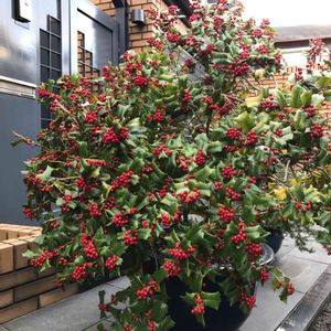 京都路地 お屋敷前の満開の実をつけたヒイラギ。 すぐ後ろの、高さ1m超のラベンダーの鉢が見事だと感心してたら、2m近い高さと大幅な迫力が、さらに見事なヒイラギの大鉢。