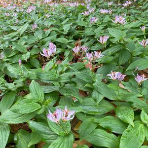 公園奥地、雨上がりの湿った落ち葉で足を取られないようにしながらも、わざと落ち葉が積もるところに踏み入って喜んでます。 長靴履いてるから屁のカッパ カッパも着てるからピのコッパ そんなことはどうでもよろしい 低い杜鵑草がたくさん咲いてました。 杜鵑草? 葉の脇に花つけることなく、20センチくらい伸びたてっぺんに1〜3輪の花です。 11月の精が来たなこりゃ、とメルヘン浸った林の中の花畑