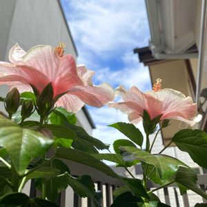 ハイビスカス グレイス3さん♡ 五番花と六番花が同時に咲きました💗✨ 狭いですが青空をバックにお花もバックショットで🌸 裏側からも可愛い♡😍