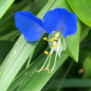 斑入りツユクサ(露草) 桜の木の下でひっそりと咲いています🤗 花は早朝から開花し、午後には萎みます🤗 花弁のうち2枚は大きく鮮やかな青色ですが、残りの1枚は小さく白いためあまり目立ちません🤗 雄しべは6本あります😃 そのうち2本が雌しべとともに前に長く突き出しています😃 中心部にある雄しべの黄色が青色を背景に引きだっていますね😃