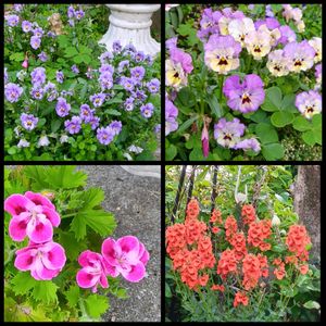 花壇 フリル咲きビオラ まだまだ咲いてるから植え替え できず😅 ゼラニウム ピンカーベル 昨日見たら咲き出してました。 ディヤスキア ブルーの八重のクレマチス蕾とコラボです。