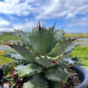【続編】 こんばんわ🌙 まだ昨夜のショックから立ち直れていないですが、取りあえずやれることは色々実施しました😔 お話を聞いていく中で容疑者は『アガベマイト』。 速攻症状や対処方法を検索し。。。 今朝、出社前にバケツにドボンし、上から水中ジェット噴射を🥺。 帰宅途中に『いとし』も購入し、家中のアガベさん&お外の花台にも噴射しましたよ。 だって👀に見えないほど小さいって言うんですもん😢 昨夜はオルトランも散布したので、これで様子を見ますね。 成長点から食べられるらしく、既に真っ黒でダメっぽいです😭😭😭 きっと、オテちゃんのあのシミもアガベマイトのシワザだったんだろうなって今さら思ってます⤵️ これも勉強と思い、前向きにですね! 育てて行く中で、色々な問題にぶち当たりながら学習していくことも大事ですものね🍀