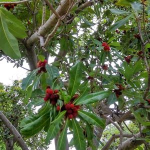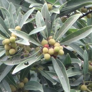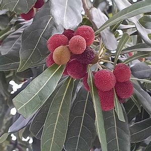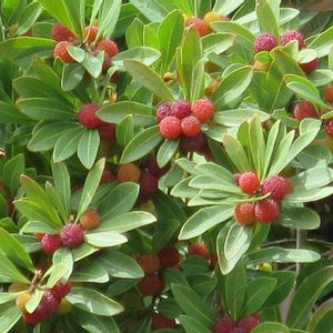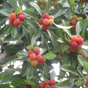 フルーツゼリーのような果実をたわわに実らせた ヤマモモ(雌雄別株) 関東地方南部以西~沖縄の痩せ地で森林の重要な構成要素だという 葉が厚いなど海岸にもよく適応できる特性を持つ 枝は多数枝分かれして球形の樹冠を作るので 最近は遠くからでもヤマモモの存在がすぐわかるようになってきました 3-4月に咲いた雌花は 6月には紅色~暗赤色に熟し生食できます たっぷりと実を実らせたヤマモモに出会うのは初めて 早速その場で試食してみました 食べるところは外果皮が液質に肥大した部分 甘酸っぱい味です 種が大きいのでジャムなどに加工するのは手がかかりそう 市場に出回らないのは痛みやすいからだそうです ただ後から知ったのですか ヤマモモの実には 結構虫(ヤマモモ虫)がついていることがあるらしい🤮 ヤマモモを食べるときはまず塩水につけよく洗ってからとAIには丁寧に食前の注意がかいてありました😭