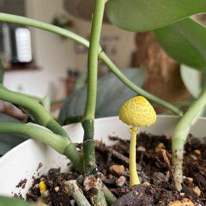 こんばんは(๑•ᴗ•ฅ🌼 ツブツブ系のダメージが大きく、葉挿しにしようと思って虹の玉をよく見てみたら、根元に黄色い🍄が😍 お友達の所も生えたって聞いたばかりだけど、噂のコガネキヌカラカサタケ🍄みたい🥰 お釈迦様のキノコとか、幸運のキノコとか呼ばれてるので、めっちゃラッキー🍀 お願い事も聞いてくれるとの噂もあるので、葉挿しが上手く行きますように🙏 お願いしています🌿 コダマちゃんも一緒に、皆さまの願いも叶えてくれますように🍀*゜