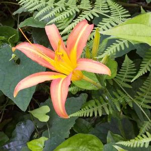 山歩きの途中、群生していました。 ユリの仲間だと思うのですが、花の中心から伸びている黄色いスジが綺麗で❤️ 葉っぱはほぼ見えなくなってました。