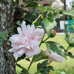 先日から咲き始めたムクゲ、強風と高温のためか傷だらけに咲いています。