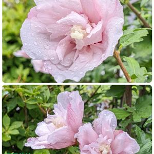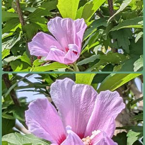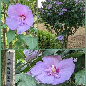 ムクゲの比較写真。 (上段) 東京・調布市神代植物公園のプルチェリマス(木槿) (下段) 住居近くで見られる 耳原花笠木槿(ミミハラハナガサムクゲ)