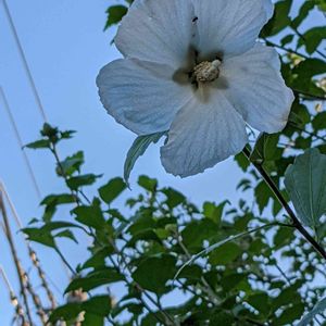 見上げてみれば‼️ 白色のムクゲ (木槿) と晴れた空。 2022年7月17日撮影
