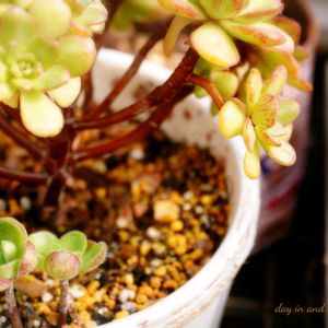 小さいアエオニウムが好き 奥のチョコチップ枯れた?と思ったけど小さーい蕾がある😆頑張れー