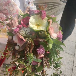 結婚式の花🌸 バラにトルコキキョウを合わせるのはいいですね。 淡いピンクがいい感じ。 結婚式の挙げた若い2人らしさが出ています。