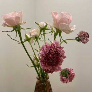 結婚式に出席した家族からのお花のお裾分け。幸せのお裾分けをいただきました💗 でも、この濃いめピンクの花は「松虫草」では? 花言葉が未亡人など、あまり良く無いので結婚式には使わない気がするのですが…。なんだろう🧐 そういったところから花のこだわり度合いが分かったりしますね。 ミステリー?ホラー?ま、花に罪無いので色がきれいで面白いので眺めてます。