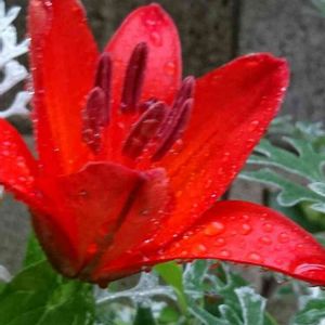 🌸スカシユリ🌸 雨に打たれて可哀想なのか はたまた、喜んで咲いているのか? 確か、同じ鉢には黄色や朱色のスカシユリの仲間が控えてます❇️