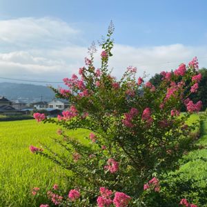 我が家のコシヒカリの田んぼと、赤花の百日紅🌸 種が飛んで、我が家の百日紅の子 田んぼの広い畔に植えて、15年位かな! 黄緑色の稲穂とのコラボです❣️💚