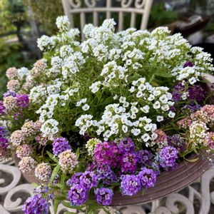寒色系の寄植えを作りました🪴 レースラベンダー、虹色スミレ、ビオラ、ストック、アリッサム、プラチーナ、斑入りアロマティカスが植えてあります