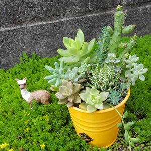 サボテンを入れた寄せ植えと、セダムの森に迷い込んだアルパカさん。💖 寄せ植えが徒長してきたなぁ。😌 それもそれなりに味があっていいけどね。😄