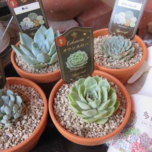 ちょうど7か月後 育ってます。個性が出てきた! 左下の名前不明な子。冬、萎れてきたので室内にいれてて最近外に出してお水やったら明らかに元気になってきた! Google photoで再度名前検索し、今回タグ変更したのあり(笑) 上左:花うらら(変更なし) 上右:銘月(変更なし) 中左:グラパラリーフ→リラシナ 中右:グラパラリーフ→ブロンズ姫 下左:不明→エレガンス(月影) 下右:月兎耳(変更なし)