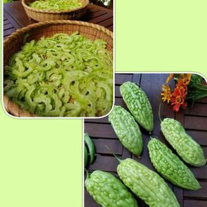 今朝の収穫サラダゴーヤ お天気よいので干しました。