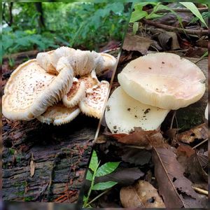 朝活🚶♀️散歩道にて… 倒木の朽木に肉厚のキノコ🍄 松林の中…マツオウジ?さんと思われる。