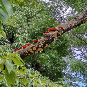 長い雨の後で、公園で、空を見上げると👀 あら、綺麗なキノコが。。。 桜の木に生えているよ🍄 向こうに見えるのはクスノキとセンダンの木🌿 久しぶりの太陽の陽射しを浴びて、深呼吸しました~(^Д^~)