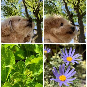 散歩中、公園に立ち寄りベンチでワンコと空を見上げる時間が好きです。 木々が美しい季節ですよね🌿✨ 右下↘️は今年も咲いてくれた斑入りの葉が美しいブルーデージー💙 左下↙️は何年か前にもらった紫陽花。 咲いてくれるといいな。 ちなみに去年は蕾で終わりました😂 直射日光が良くないとのことなので、移動しなきゃかな💦 そして、バトンハウスさんの🏷ワンワン祭りに初参加させて頂きます🙇♀️🐕💕