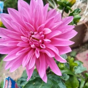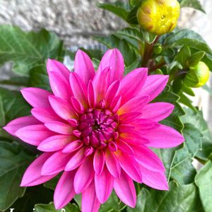 おはようございます٩(*´꒳`*)۶ 台風が段々近付いて来た横浜 風が時々ゴーゴーいってます☔️ 彡(°o°;)彡 昨日は台風に備えて🪴軒下に寄せました 綺麗に咲いたピンクのダリア、蕾は黄色いです🌼 外にずっと出してるウンベラータ🌳 入れようとしたら根っこが下から生えて 動きませんでした😂それなら倒されないかな 今度 植え替えてあげないとね➰🌳💦