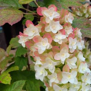 カシワバアジサイ(柏葉紫陽花) 花言葉:「慈愛」「清純」「汚れなき心」 お花と葉が 少しずつ色づいてきました
