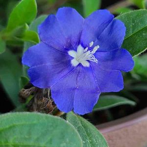 アメリカンブルー 別名:エボルブルス 花言葉:「ふたりの絆」「あふれる思い」 さわやかな青色の 小さなお花です。 この通りに来ると、 片隅に置かれた鉢をいつも覗きます。 元気にしてる? 「ここにいるよ。元気だよ!😊」 笑ってくれた気がして、安心して帰ります。