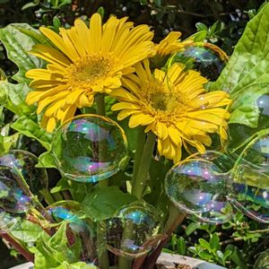 おはよーございます❤ ガーベラさんがまた咲いてくれました👍😍 シャボン玉と一緒に撮ってみました💛🧡💚💙💜 週末素敵にお過ごし下さいね❤🤗🤗🤗