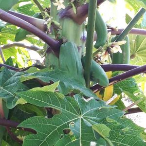 大分でもパパイヤ⁉️ 路地栽培で育てられるんだ👀‼️ ビックリ😍⤴️⤴️ 数年前から気になっていた畑🎵前は奥の方に植えてあったので確信出来なかったけど😁👌今年は道路側の直ぐ目の前に👀🎵植えてあるので!近づいてパチリ📲やっぱり思った通り実ってます🤣👌