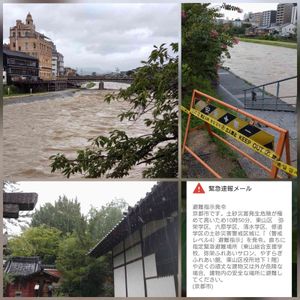 今日の記録 お盆で母の実家へ行ってました お寺さんが読経されてる間にも 緊急速報メールが何度も鳴り響いて 激しい雨音を聞きながらの いつもと雰囲気の違うお盆でした ↖️帰りに団栗橋から 四条大橋を望む 鴨川が変貌してました ➡️河原へは立ち入り禁止 ↙️雨の建仁寺境内 ↘️少しずつ近付いて来る様に何度も鳴る携帯 この後も降るそうです☔ 明日の昼過ぎまでがピークだとか… どうか何事もありませんように…🙏 p