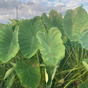 里芋の葉🍀実家の畑シリーズ 超BIGサイズの葉っぱです😅 まるでジャングル😱左側のグラジオラスもビックリ⁉️ パラボナアンテナ📡みたいにお日様の光をいっぱい浴びて、子芋達に栄養届けているのでしょうね🤗 大きくなぁれ!おいしくなぁれ!*\(^o^)/*