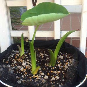 冷蔵庫の中で芽が出てた里芋を植木鉢に入れてみたら葉が出てきました。 日差しの強い日にお花の日除けになってくれたら良いなぁ。