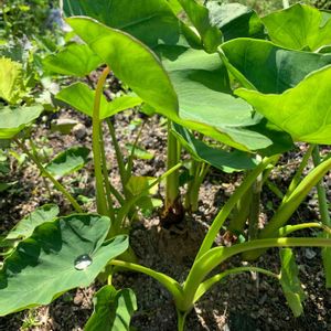 雨が上がった〜と畑に行くと 大きくなって来た里芋の葉に 可愛いしずくがたまっていました💠
