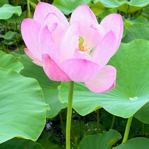 開き始めた蓮の花🪷 葉の上に咲いてるように見えて🍀 "ポン"という音は聞こえなかったけど 可愛らしいピンク色💗綺麗🥰 ハンゲショウが涼しげでした🎐 午前中に🤳