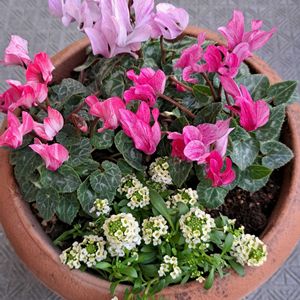 おはようございます😊 今朝起きたら1℃ 寒い朝でした 寄せ植えです🌸☘️ 🩷💗 ガーデンシクラメン ピンクでもよ~く見ると 少し色が違うのよ😉 🤍 アリッサム ガーデンシクラメンが愛らしくて❀(*´▽`*)❀