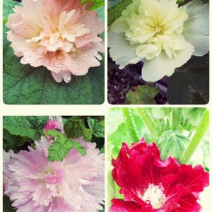 我が家の庭😊💕👌 立ち葵の花💠4色😍 やっと咲き揃いました 赤色だけ🤔タグ🏷️の 八重咲きと違うぞ👀🎵 まぁ👌値下げ💴⤵️の 50円の苗だからね😜