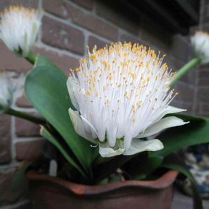 Haemanthus albiflos 職場で去年撮影した マユハケオモトの花✨ 写真を探したけど💦 この1枚しかなかった/(^o^)\ 手前の金の成る木が邪魔をして マユハケオモトの葉っぱが 写ってない…_(:3」z)_ そして 今年はまだ咲く気配無いです(´༎ຶོρ༎ຶོ`)