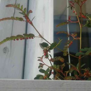 職場の花壇に生えてきたんですが、何でしょう? 雑草ですかね? おじぎ草の様な葉っぱです。 今日見てみると、葉っぱの裏に赤い小さな実が✨✨
