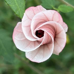 高砂芙蓉(タカサゴフヨウ) 白色に近い淡いピンクの5弁花 タカサゴフヨウ 濃赤紫色の花の中心部から 花弁の先に向かって 同色の縦スジが放射状に 広がっているのが特徴です
