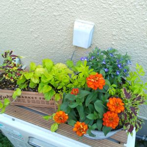 どこで撮影しとんねん!って感じですが😄、、 右はビタミンカラー×青×ライム色の組合せにしたくて作ったけど、なんだかロベリアが仲間外れな感じ?笑 左は小物入れ的なやつにジュートの布を敷いてアジュガさんとコリウスさんを植えてみた。 コリウスがいい感じにモリモリしてくれたらいいな😊
