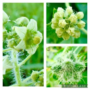 アレチウリ・ウリ科・北アメリカ原産・特定外来生物・難防除雑草。 ①雄花は直径1.4cm ②雌花は球状ににつく③果実。