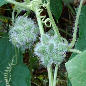 【荒地瓜】《ウリ科》 花言葉 「嫌われ者(クズをも覆う)」 巻きひげのあるつる性の1年草で、 草姿がウリ科の植物に似ているので瓜の名がついたが、果実はまるで似ていない。 トゲ の生えた果実は特異でこれに似たものは今の日本にはないという。 荒地は文字通り河川敷などの荒地に繁茂する事から。 雌雄同株異花序、 同株雄花序は長い柄につく。