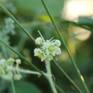 キャンプサイト脇の空き地に「キクイモ」と「アレチウリ」が混じってゴチャゴチャになって花を付けています😁 アレチウリは雌雄同株で、↗️は雄花で長い花序柄の先に花を付けます。 その下は雌花、短い柄しかなくテマリ状に花を付けます。 その下が果実、針のような長い毛というかトゲというかを密生させます、これ痛いんですよねえ😓
