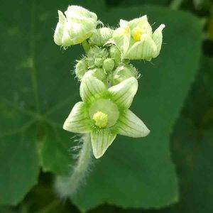 アレチウリ 雄花と雌花を拾い出してみました🤗 雌雄同株。葉腋から花序を出し、黄白色の花をまばらにつける。雄花と雌花はそれぞれ別の花序につき、雄花序は長さ10〜15cmでまばらに雄花がつく。雄花は直径1cm。雄しべは花糸も葯も合着し、キノコのような形になっている。雌花序は短く、雌花が頭状に集まってつく。雌花の柱頭は3個。果実は長卵形の液果が数個集まってつき、金平糖のように見える。表面は軟毛と刺が密生する。なかに種子が1個入っている。